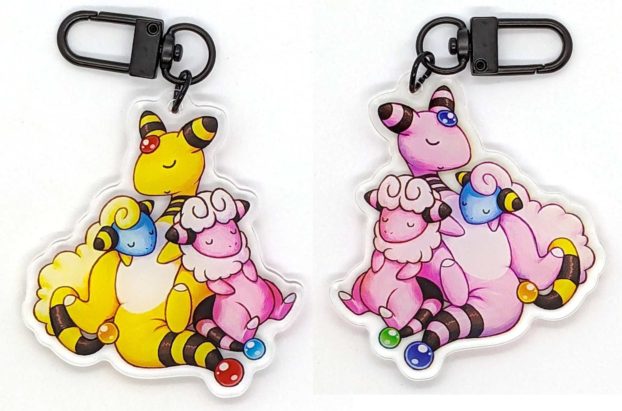 Double-Sided Acrylic Charm of Ampharos, Flaaffy, and Mareep from Pokémon. The back face has their shiny colors.