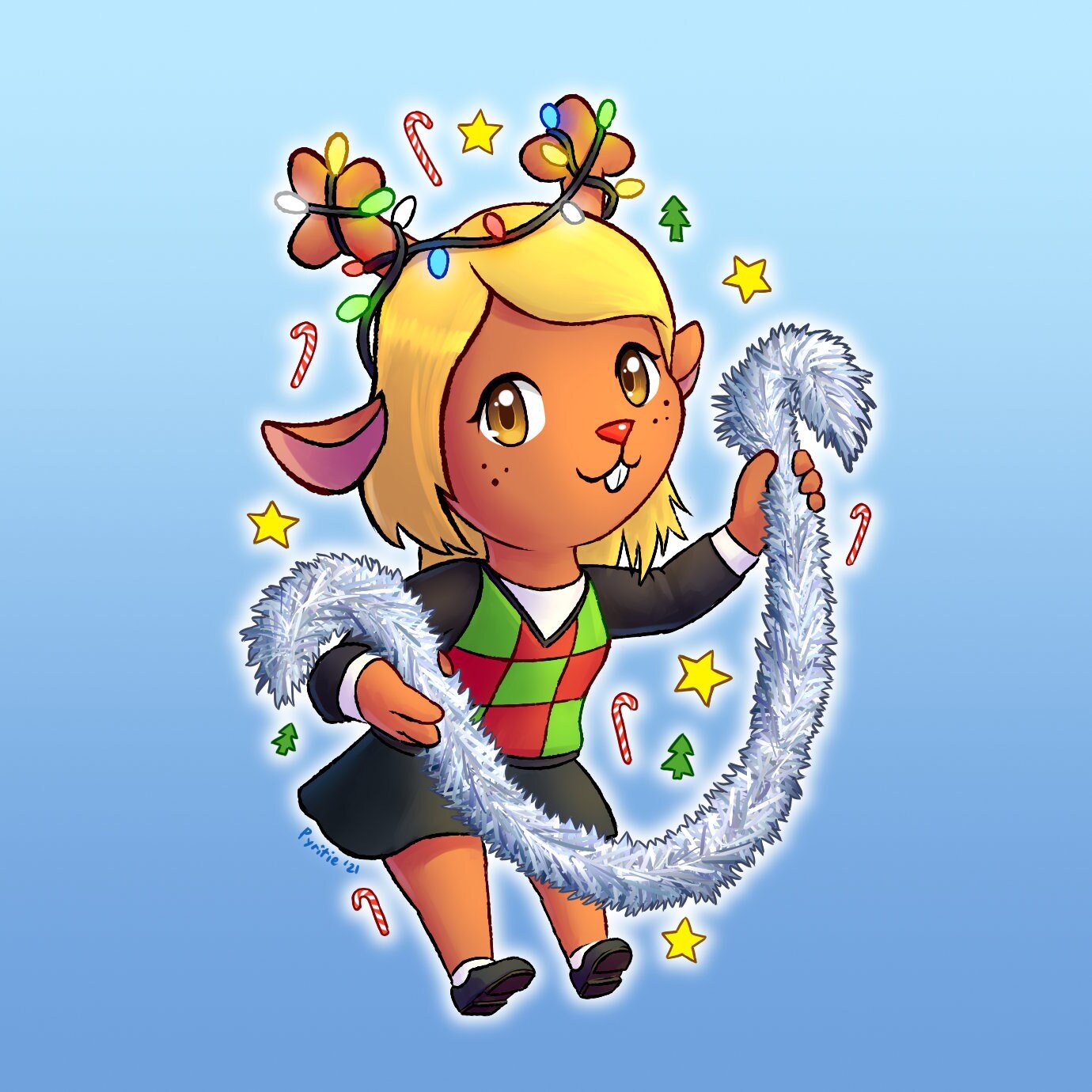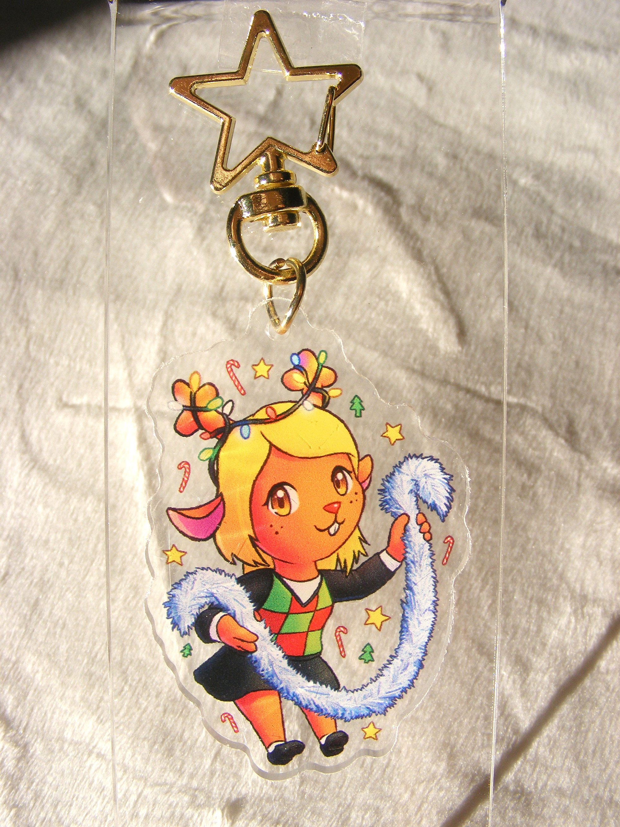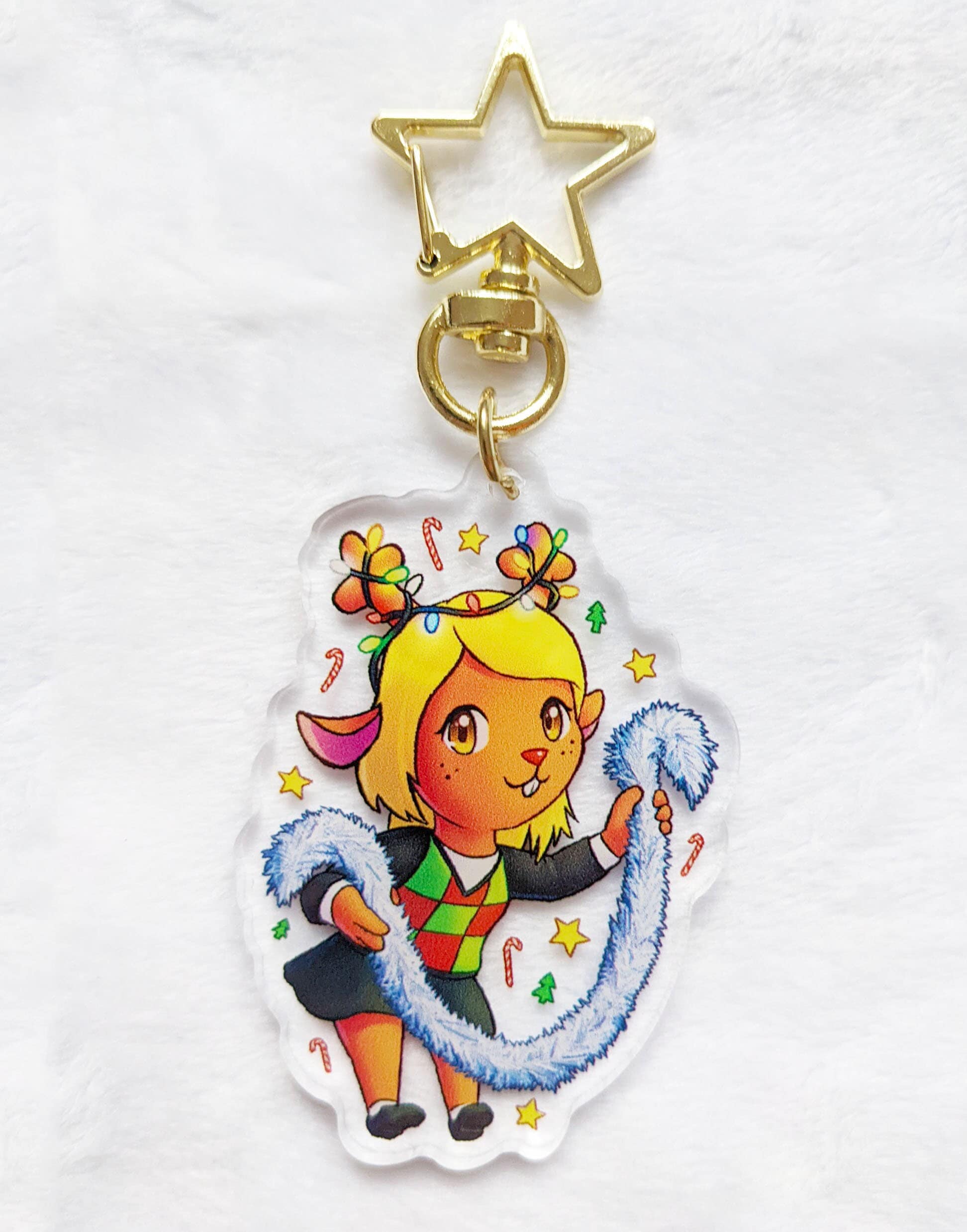 Double-Sided Acrylic Charm of Noelle from Deltarune in her Light World form, holding tinsel.